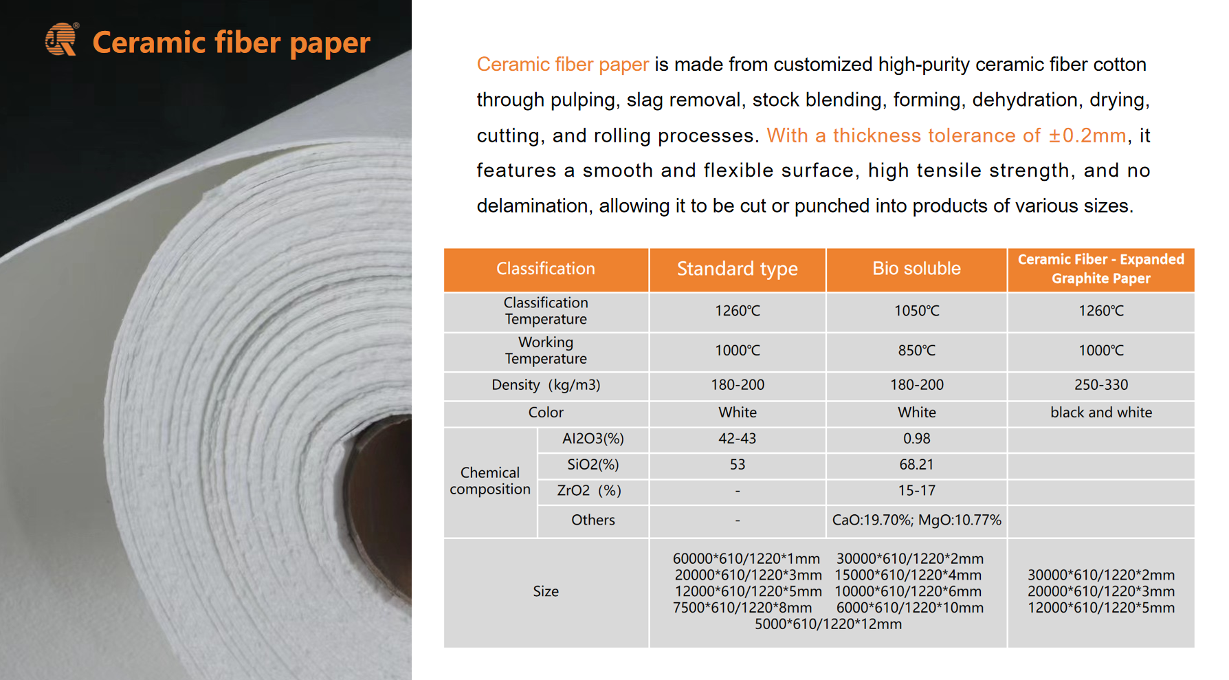 Our ceramic fiber paper is produced from customized high-purity ceramic fiber cotton via a rigorous process: pulping, slag removal, stock blending, forming, dehydration, drying, cutting, and rolling.